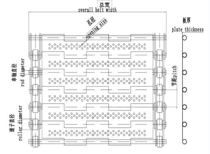 - Select the appropriate chain model and support shaft specifications according to the width, length, operating speed, and mechanical configuration of the mesh belt.
