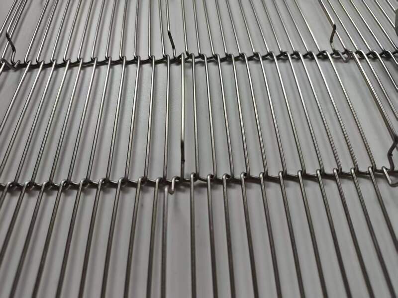 Rod Network Conveyor Belt, also known as an enrober belt, is made of highly elastic and flexible stainless steel wire. It features a single-layer structure, making it lightweight, and is driven by sprockets. This type of belt is usually designed with a single edge, while double-edge construction is used for special applications. Flights can also be added to the belt surface. It can be used for straight running as well as 90-degree and 180-degree turning applications.